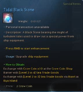 Tidal Black Stones are obtained by killing sea monsters and by salvaging sunken ships. They can also be purchased from the Marketplace.