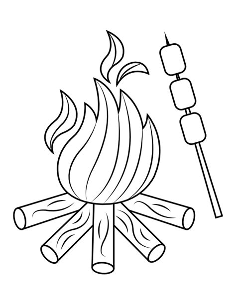 The campfire coloring sheet typically includes a campfire, marshmallows on sticks, and other campfire-related elements.
