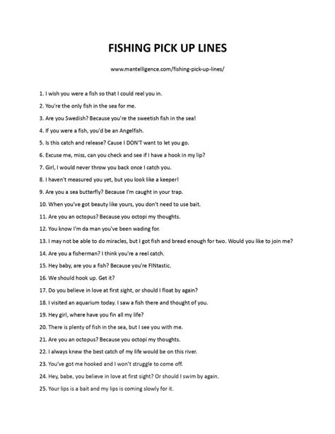 Greetings, readers! Welcome to our comprehensive guide to the art of fishing pick-up lines. Whether you’re an avid angler or just looking for a clever way to break the ice, we’ve got you covered. So, grab your bait and get ready to cast your line!
